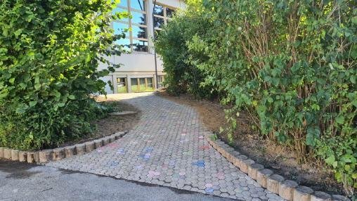 Wegebau in deutlich kleinerem Ausmaß wurde an den Außenanlagen des Kindergartens betrieben. So wurde im Zuge der Erweiterungsmaßnahmen der Kinderkrippe der Fußweg, welcher zwischen Kindergarten und Weihungstalhalle verläuft und auf die Zufahrt zur Schule mündet, den Außenanlagen des Kindergartens zugeschlagen. Im vergangenen Jahr wurde dieser nun wieder neu angelegt. Es wurden hierfür übrigens die alten Pflastersteine, die von unseren Kindergartenkindern bemalt wurden, verwendet.